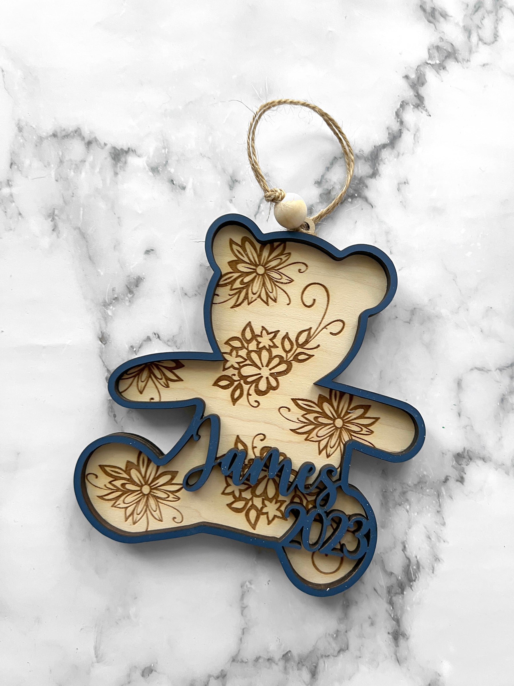 Handmade wood ornament, personalized with name and year.