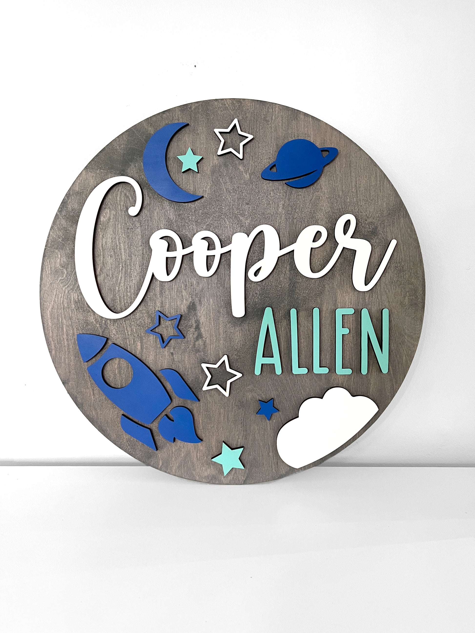 Size: 18 inch round stained in your color of choice. The rocket ship is laser cut on maple plywood and hand painted in navy, aqua and white. If you prefer a different color theme, please reach out to me ... we love custom orders!